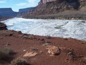 The other pole was meeting three nice folks who share a few of my more esoteric interests. I forgot that between Moab and Mexican Hat is a substantial chunk of Utah, and rolled into the Mineral lot a bit before 11. Killing the lights still woke up Chris and Dave, and I met two very perky heads sticky out of sleeping bags. I fell asleep quickly. It was fortunate that their alarms died, as I spent twenty minutes in my bag doing remedial stove-pump maintenance so I could make tea and ramen (true breakfast of champions). Cooking in the truck was a brilliant idea, and my feet were nice and toasty when we got off on the road.