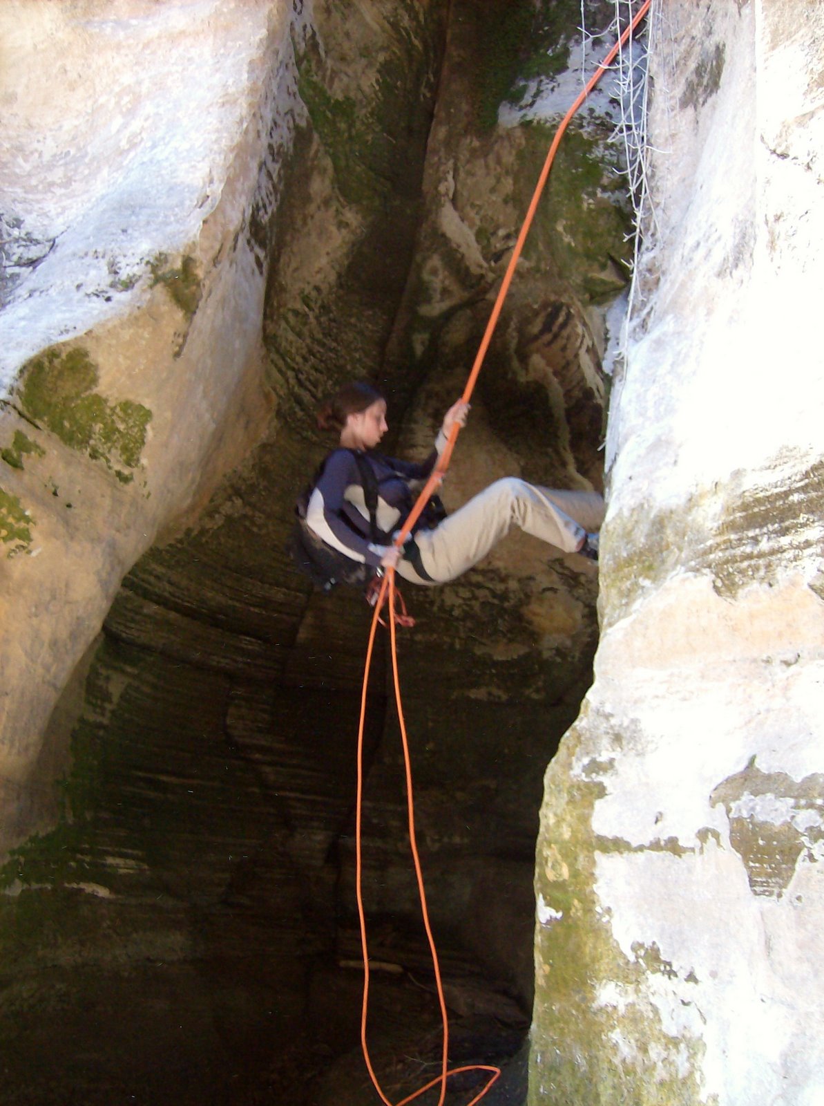 ~700 foot shear drop. Once you drop in and pull the ropes, you’re committed. Our directions were vague, so we took a while to find the proper tree to start the sequence. In the end, common sense and experience usually prove to be a good guide. Someone had to do it first, and they typically take the line of logic. In our case, two fat trees at 170′ and 200′ led to a nice ledge with bolts, and not-so-nice ledge with bolts, and then a big ledge and a 35′ rap of a shrub into the depths of the slot shown above. Then it was only another 4-5 short raps in a quarter mile to the narrows.