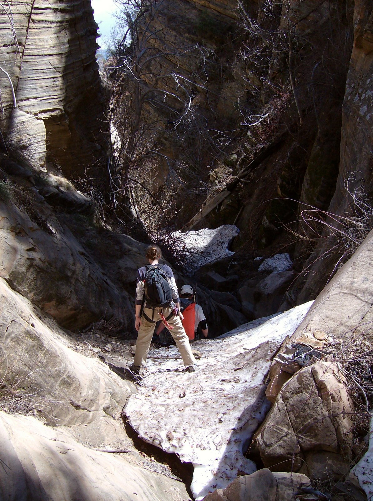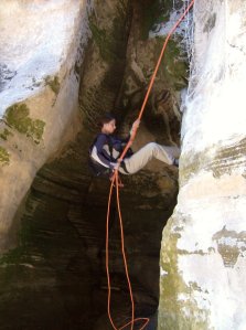 We did. I came to canyoneering from climbing. In climbing you’re dealing with falling bodies, and large forces. In canyons, you’re rappelling only, and ideally facing only static forces. That, coupled with a strong desire to maintain style and eschew drilled bolts, has brought forth some creative anchor building. Piles of rocks, rocks buried in the sand, knotted webbing wedged in cracks. It’s some good technical, analogue problem solving. With penalty points.