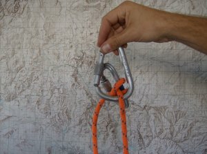 Rap line clove hitched to the spine of one carabiner, “blocking” the line from pulling through the anchor link (another, larger biner) when weighted.