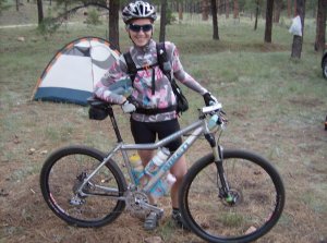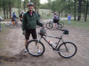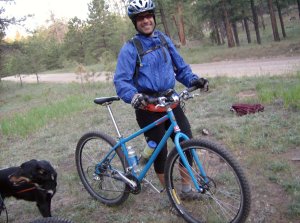 Ex-racer chicka Dara Marks-Marino, so fast you can’t get a clear shot of her and her Titus. (Actually a combo of low light and our cheapo camera.) She did a lot of strong riding for someone who claimed to be just out for a long ride.