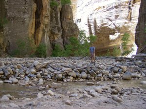 We both have strong ankles, good balance (years of hiking and ballet, respectively), and a reasonable amount of experience with he boulder hiking and cobbled wades that make up the meat of the Narrows. We passed a few backpacking parties who demonstrated the conventional wisdom that pasty and untraining vacationers carry too much on their overnights and get eaten alive. The folks you see limping off the bus at the visitor center.