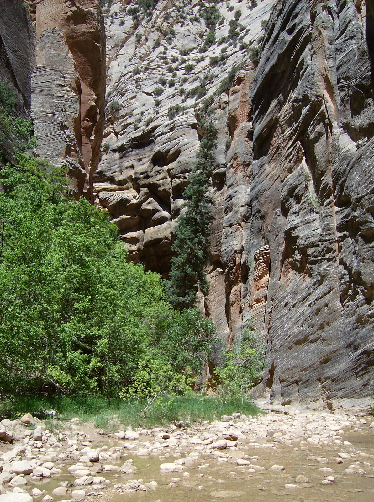 We both have strong ankles, good balance (years of hiking and ballet, respectively), and a reasonable amount of experience with he boulder hiking and cobbled wades that make up the meat of the Narrows. We passed a few backpacking parties who demonstrated the conventional wisdom that pasty and untraining vacationers carry too much on their overnights and get eaten alive. The folks you see limping off the bus at the visitor center.