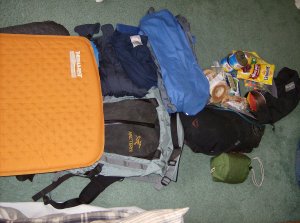 Here’s the Grand Canyon summer backpacking kit. Not shown are spare socks, cordage for the tarp, and one each of a grapefruit and navel orange.