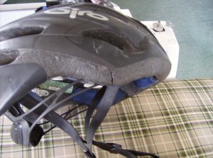 Had some good fun doing two laps of the Old-Fashioned Mtb Race course. Messed around on the first, finding trail junctures and letting my legs stretch out after yesterday. Then I changed bottle and put the hammer down, clocked a 1:04 in spite of fools who wouldn’t let me pass (does it feel good to blow by guys on Stumpjumpers with shiny new King hubs, on a fixed and rigid Surly!) and the aforementioned crash. I was cookin’ down Fort Valley, a bit less than a mile from the end, when the front Nano washed definitively. I was in the dirt before I knew it. First hard crash in a good long time. Got a Resolution to replace the front Nano, along with my gaudy new lid.