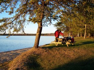 Pushing our cabin rental up was not a problem, and we spent four very nice days (including our anniversary) stoking the wood stove, eating, reading, and watching the weather. I snuck out occasionally to chop more wood and ride my bike on flooded and overgrown snowmobile trails, burning energy riding through 100 meter puddles and once doing a perfect endo when my wheel found a hole hidden in the grass. We paddled the boat a bit, got burgers and beer and played pool at the hole in the wall down the road, petted the resort owners dogs, and got a surprise pan of brownies and bottle of champagne that M’s mom had paid the owner to make for us. Sad to do so little canoeing, but relaxing to enjoy space and quite and unemployment.