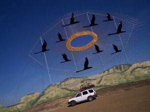 This massive sculpture is off I-90 in western North Dakota. Note the Rocket Box, two bikes, and two 5 gallon water jugs crammed onto the roof. Exacting spacing requirements.