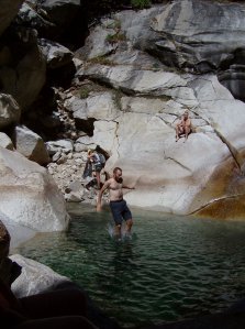 Jumping the final pool to cool off, after the last rap down the back wall.