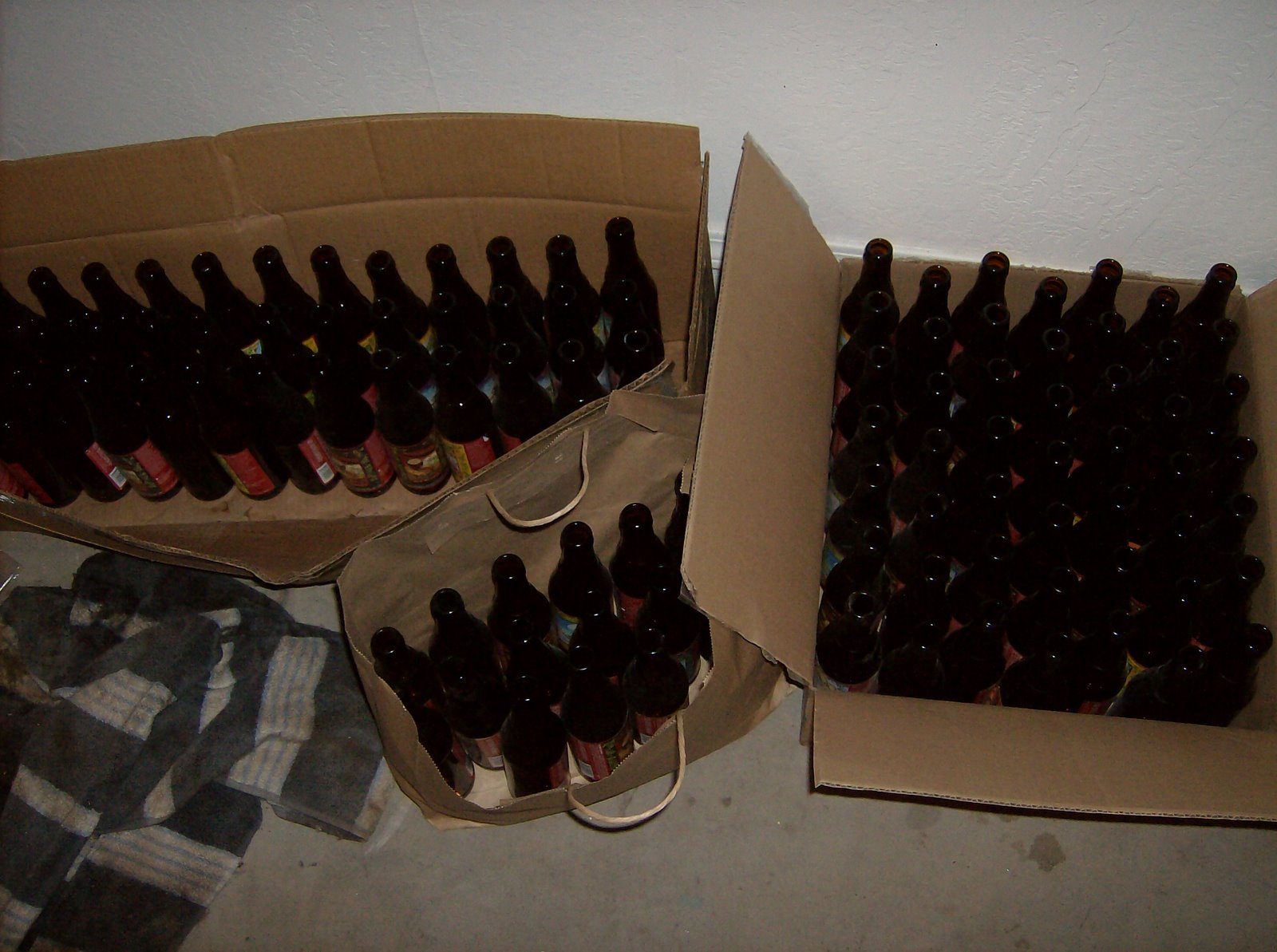 These are the 106 New Belgian bottles. 55 other beer bottles (M tells me), and many salsa jars. Not too bad.