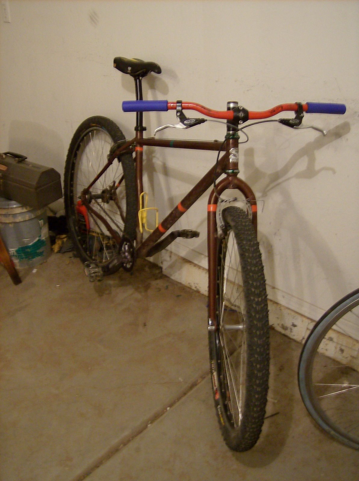 The Monk got a serious retro makeover, the old riser and ESI grips (to free up a midge for M), freewheel and v-brakes. The track cog is still on, Dave. Under parking lot conditions the bars feel very strange, indeed.