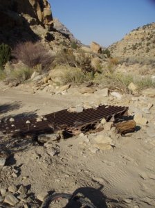 Washed out cattleguard in Collet Canyon, proving that it was at one time a serious road and not a mere “route” down the wash. I thought out launching off the 1′ drop on the far side, but let me lameness get the better of me.