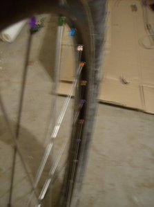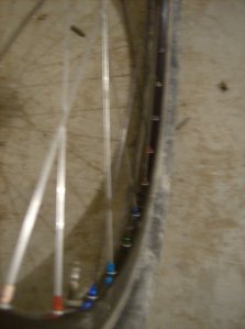 10 different colors, to be exact. No pattern to either spoke or nipple color. Now it waits for the final touches, and action. Hopefully in time for KY camp next month.