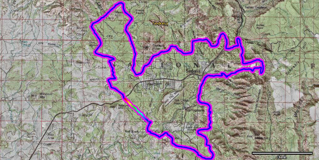 Munds-Cowpile-Jim Thompson-Chimney Rock-Dry Creek Rd-Long Canyon Rd-Deadman’s Pass-Cockscomb-Rupp-Girdner-Herkenham-Old Post-Templeton-Llama-Little Horse-Broken Arrow.