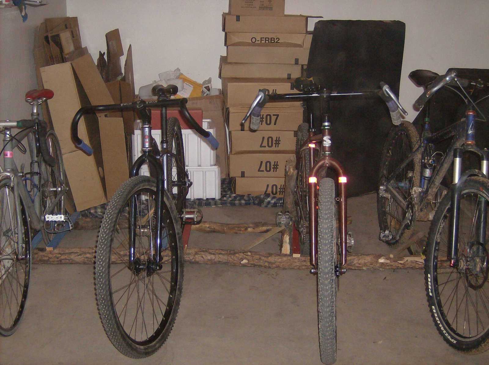 Odd bits of wood, nails, some zip ties, and one old road rim. Bikes arranged big to little. The center pair will even be functional by the end of the week.