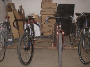 Tasks: collapsing and stowing boxes, disposing of trash, organizing tools and car detritus, and sweeping a gallon of dirt and various bike parts (chain links, small bolts, cable bits, rubber fragments). After, a good home for the bikes was needed.