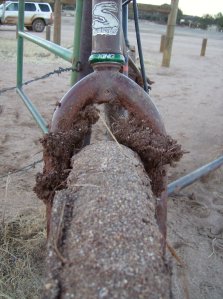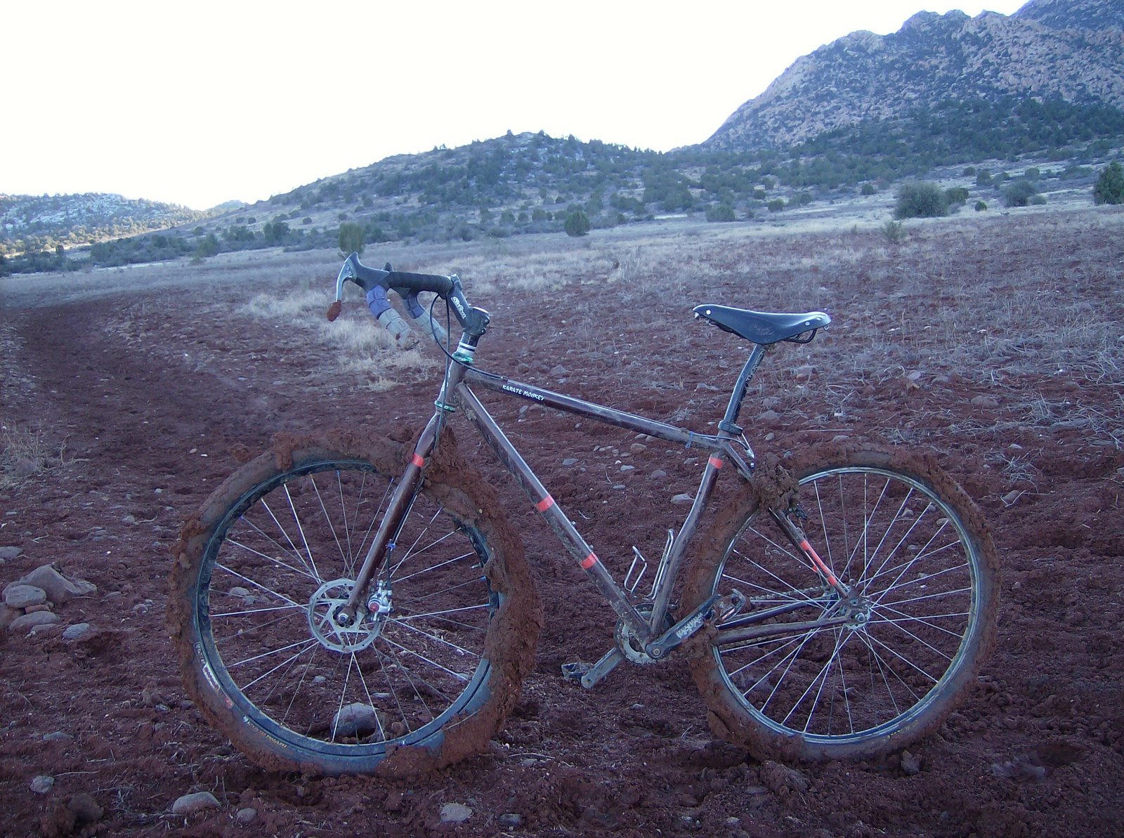 After scraping and dragging back to the trailhead, I cleaned things enough to ride, but was hemmed in by muck, unable to got further than a quarter mile in either direction. So I tried to salvage the ride, cruising some normally unrideable washes, and doing some 30 second intervals on a short hill. I still came home frustrated.