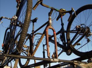 Yep, that’s M’s new gravel machine on the left, Pom Pom is it’s name. She insisted on building it Friday with precious little assistance from me, and did a much better job than I did a year plus ago trying to figure out BB7’s with no help save the manual and the net. I pitched in a bit that evening, we got underway, and despite a discouraging profusion of mechanicals (goatheads, lost chainring bolt, lost derailleur pulley) put in a good three days of riding. Makes my inadequacies seem as silly as they may well be.