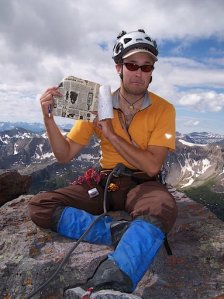 I noticed this hidden gem on the Cheesteak’s blog earlier, and decided it needed to be highlighted. This would be back in the summer of 2004, escaping Moab summer heat in the San Juans west of Ouray. Summit of either Coffee Pot or Tea Kettle, two little easy 5th volcanic sub-peaks along the ridge near Sneffels. The rope and rack were pretty unnecessary I recall, the real challenge being the big, impressively steep talus slope to gain the ridge in the first place.