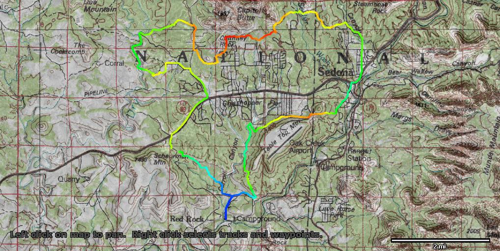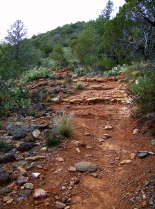 New stuff to me, most, that will be featured on the Sedona BFL. It confirms my suspicion that it’ll be a true mother of a race. I got 20.8 miles and something like 3400′ of climbing in three hours, and almost all of that climbing was short grunts with lots of ledges and waterbars. The red section, above, in the middle of the ride is particularly relentless.
