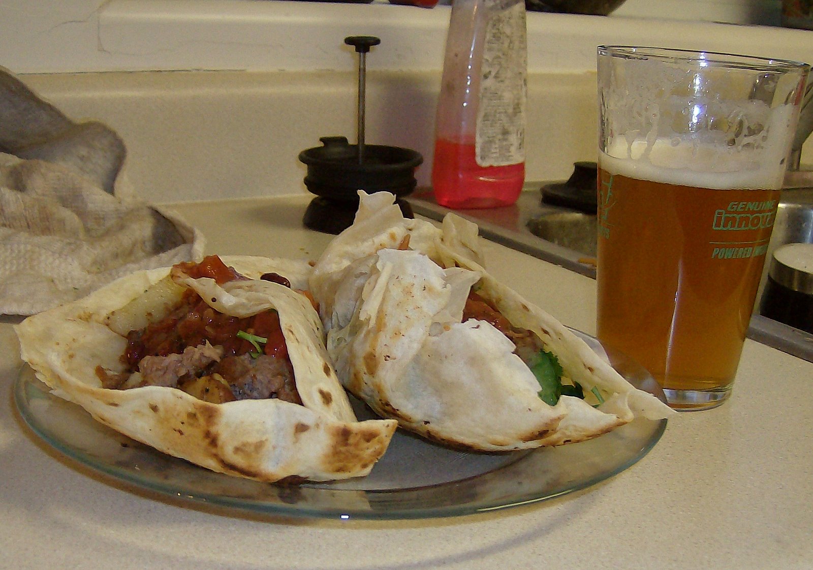 Taco: turkey italian sausage, potato, refried beans, salsa, avo, lotsa fresh cilantro, bit o’ mozz.