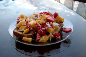 There’s multi-grain french toast under those mangos, strawberries, and coconut, somewhere.