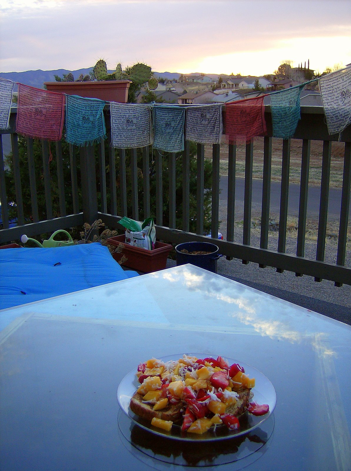 There’s multi-grain french toast under those mangos, strawberries, and coconut, somewhere.