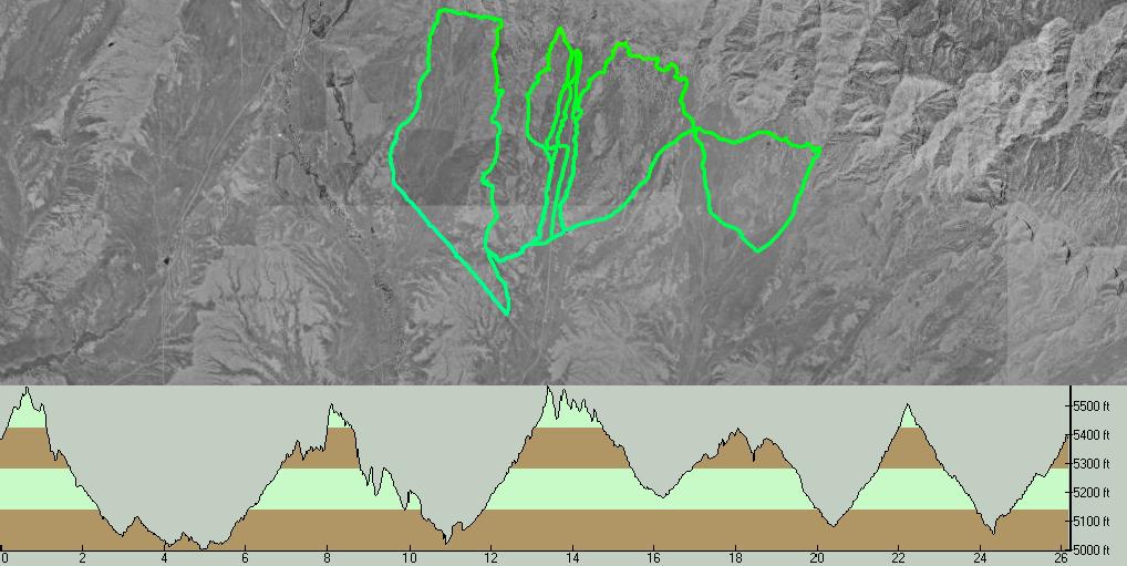 Lunch Loops and the Ribbon. We rode from the Tab TH, up the road into a nice brisk headwind, then down the brake burner. Had a nice balletic crash when I clipped a boulder with my left hand on Holy Cross. Not sure what happened, hit my knee and did a dance with the bike, ending still upright, but fifty feet downslope. The GPS turned off then, too.