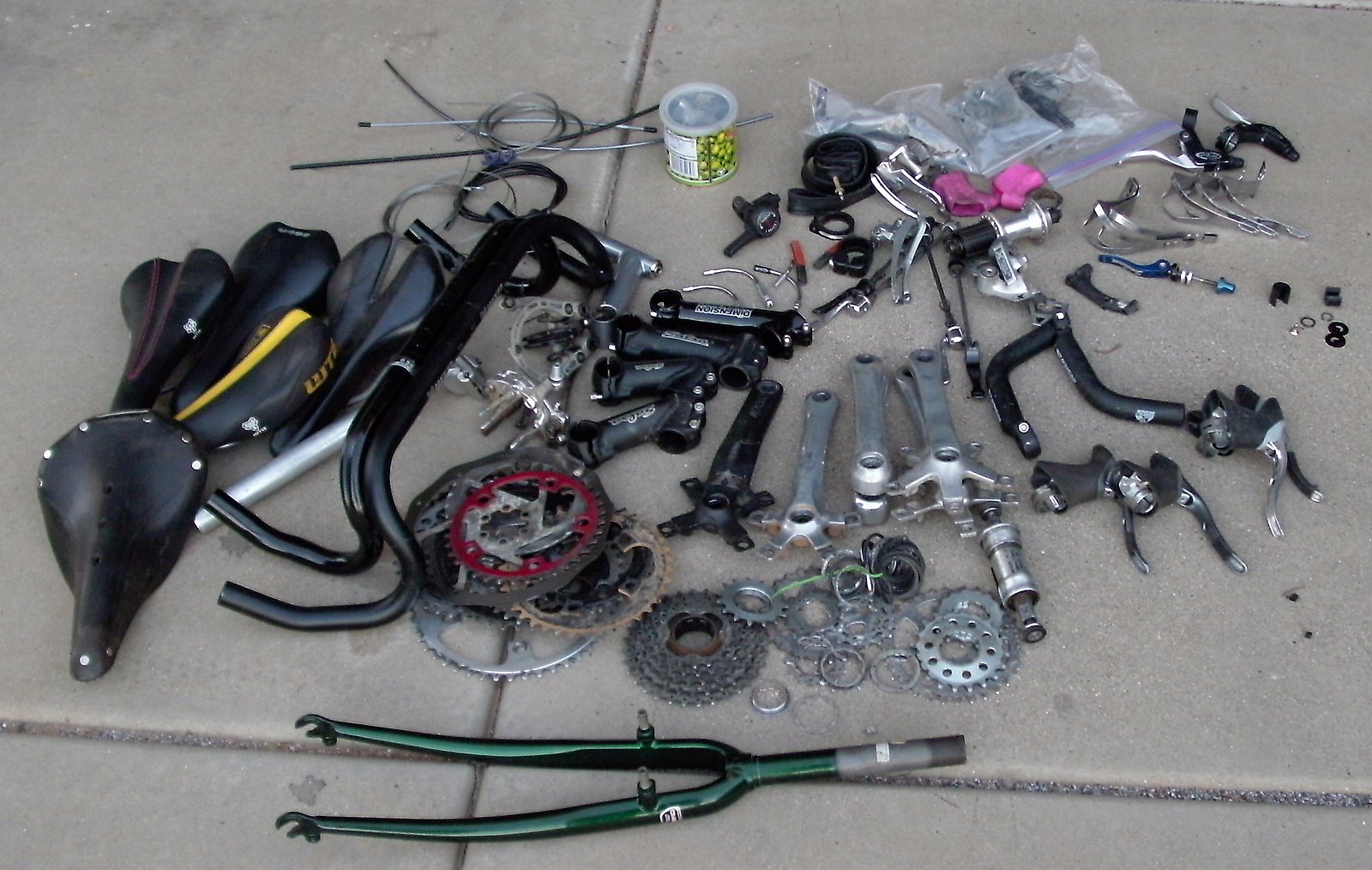 This is all the random, unused at present bike crap that I packed in a box this evening. A decent bit more went into the trash. Nine (!) chainrings.