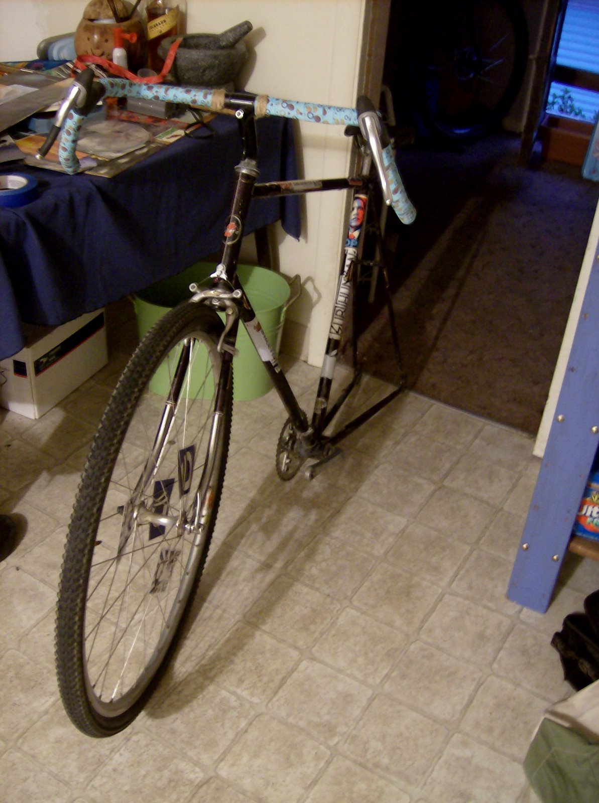 I was very pleased with the tire clearance. Could fit a 42 if I wanted. I did find a flaw in the brake design, the unavoidable tendency for the (cyclists’) left to retract first. Fixed with a pair of zip ties. I added modern inserts and Kool stop pads, my own bars, levers, cables and housing, and a straddle from the shop, and I have a brake that has great feel, and a perfect monstercross cockpit. Bar tape (no $ spent!) is pieces of my yoga mat taped in strategic places, with some of M’s more hideous ribbon wrapped and shelacked on. Only thing left is the rear wheel.