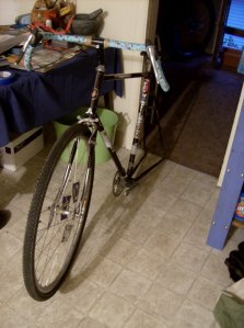 I knew before moving here that I’d want a beater townie of some kind, and on Monday night I got to work at Free Cycles here in town. It’s a cool idea, and a neat shop. Old hardwood floors, big space, fairly well organized, and massive bins of old crap laying around. Most of it is, predictably, junk, but there are gems in the piles.