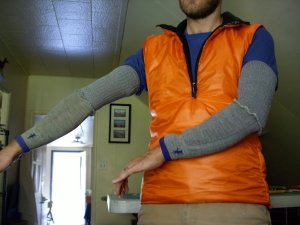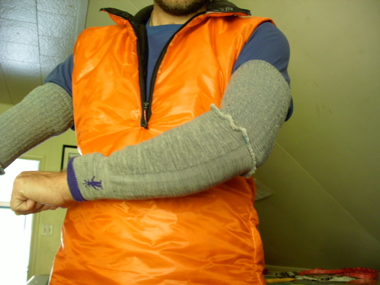 Make some arm warmers. These come from a pair of “standard” wool Smartwools (upper), and lightweight Smartwool ski socks (lowers). The combined length is just perfect. Easy to do, provided you have a machine that does an overcasting stitch. I’m not confident it would work without that.