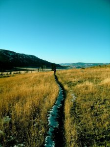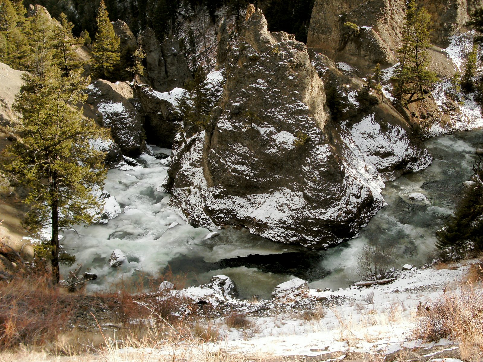 Phillip, the “little trench” sustains itself right over a hundred foot waterfall, approximately two feet farther around the bend… and then opens into a big flat valley. Also, the photo was taken from a major road, Dave says, if you’ve been to Yellowstone, you’re probably seen it. But everything looks more fun in the snow :)