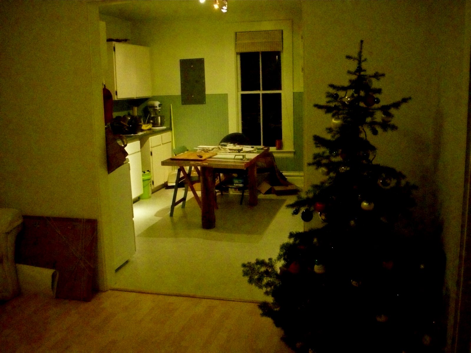 M got a holiday tree and clearance ornaments from Walmart. This shot shows my favorite things about the new place, open spaces, light, and room for company. Everyone who’s been putting off visiting can put us on the calender, today we got a coach that will comfortably sleep a 6 footer.