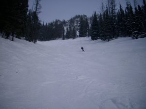 My “falling leaf” technique was used during one brief, steep, skinny section that had sheets of ice between each mogul bump.I’m fast on blues too, and I used to be good at blacks (I’ve even done double blacks at Snowbird and Sun Valley) and as long as it’s groomed it’s fine, but Snowbowl snow is all weird and chunky and compacted, and their moguls are all misshapen, and I’m on tele skis now, and this is my third day of skiing in four years, so -eat it – bitch.