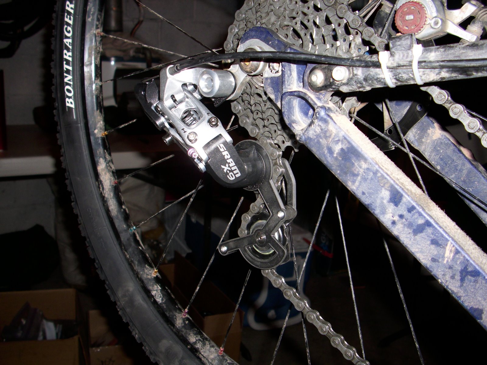 X9 shortie derailleur. Finally getting rid of that horrid old XTR trigger shifter I’ve been using for the last year. It did need some modification for use with only six cogs. Comparatively minimal swearing was involved.