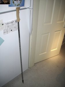 I also completed my trekking pole project. Now the BD poles can stay ski poles, and I can avoid bar tapping the handle for summer use.These are cut down skate ski poles from the ski swap last fall, with Gossamer Gear cork grips (which are fantastic in both shape and material). Grips fit on the cut down poles perfectly, with no attachment devices needed beyond a good whack against the basement floor. Tips ground down to symmetry with a dremel and bastard file. 6 oz per pole almost exactly, $30 total outlay for both.