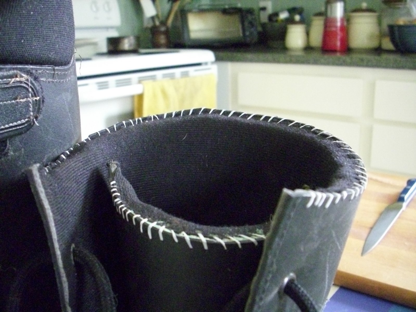 The outer material of 1.5 mm plasticy stuff necessitates hand sewing with a fat needle, dental floss, and a pliers, which is a pain. And slow. I hope to finally go skiing on Monday.