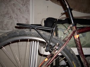 On the rear. Easily done; a new hole for the flexy bracket needed to be drilled, and my seatpost bottle mount came in handy. The bottom brackets rotate on bushings, if not totally readily. As always with racks, structural soundness is a question, but there’s only one way to find out.