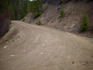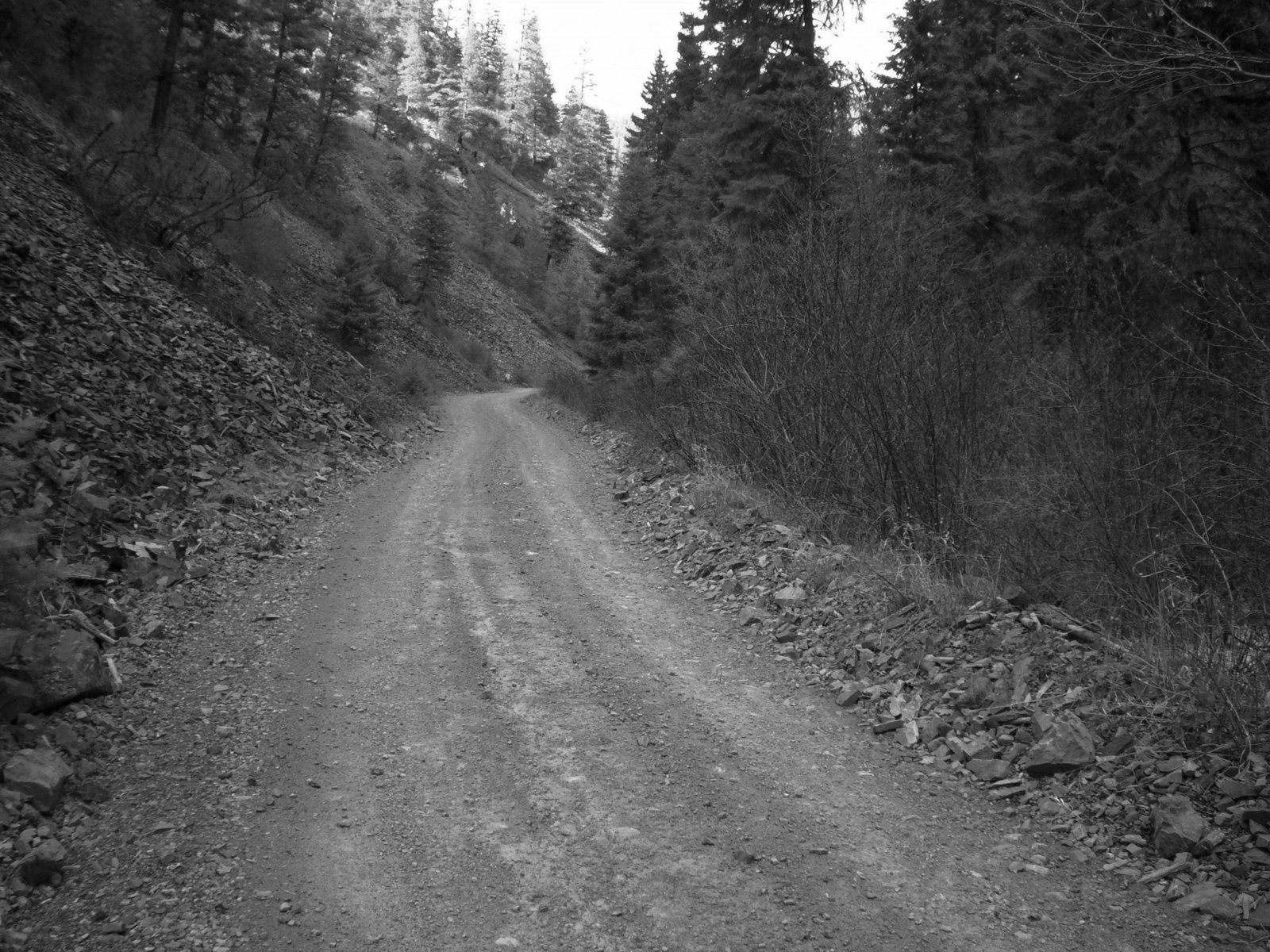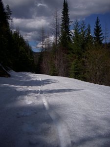 Eventually the road wrapped around from south facing to north, and wall to wall snow beckoned as far as I could see. having just got my feet warm again, I demurred, and consulted the map. A series of traverses on logging roads led to within ~1/3 mile of a road which would take me downhill towards civilization. What’s a little off trail work?