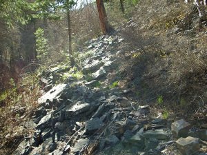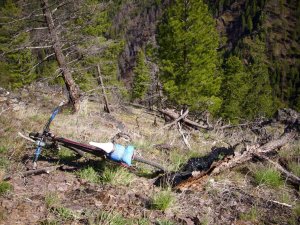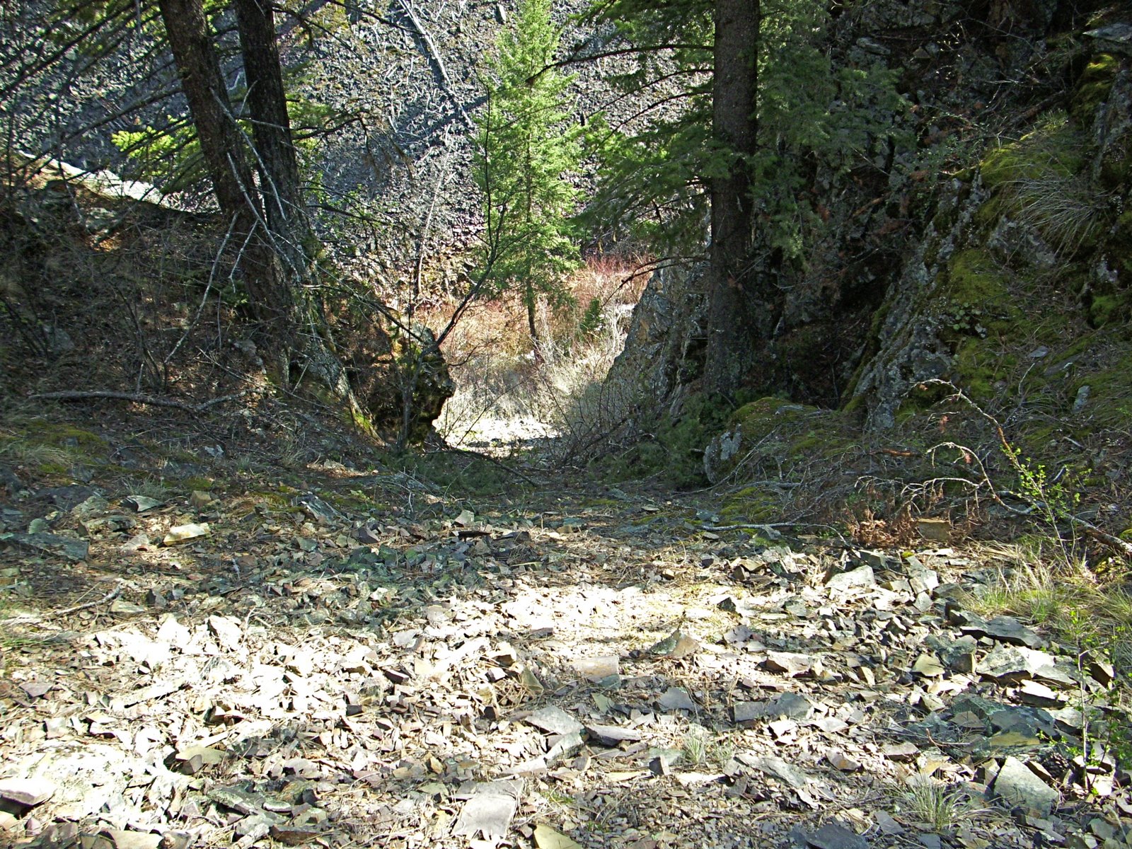 The reason no logging road led down that slope and drainage was because of the cliff bands. The initial half of the route (see above) wasn’t too bad, steep elk trail that would’ve been mostly rideable if I weren’t still feeling gunshy from all the crashing I’ve done lately. Soon enough, the best route down revealed itself as the following: