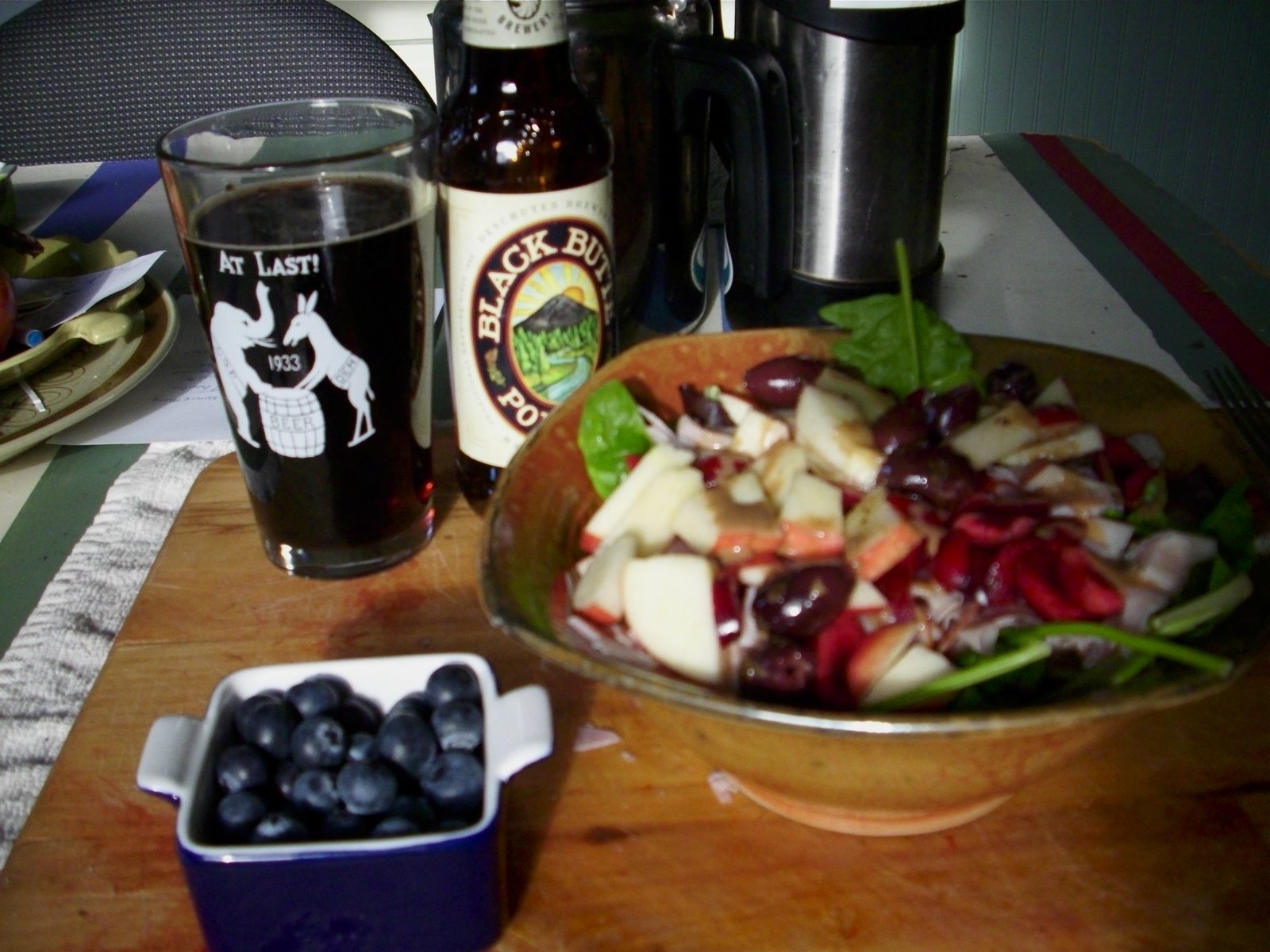 Been a while. Beer in the FDR museum glass, greens-cherries-apples-ham-olives, blueberries. I love summer for the fruits and veggies.