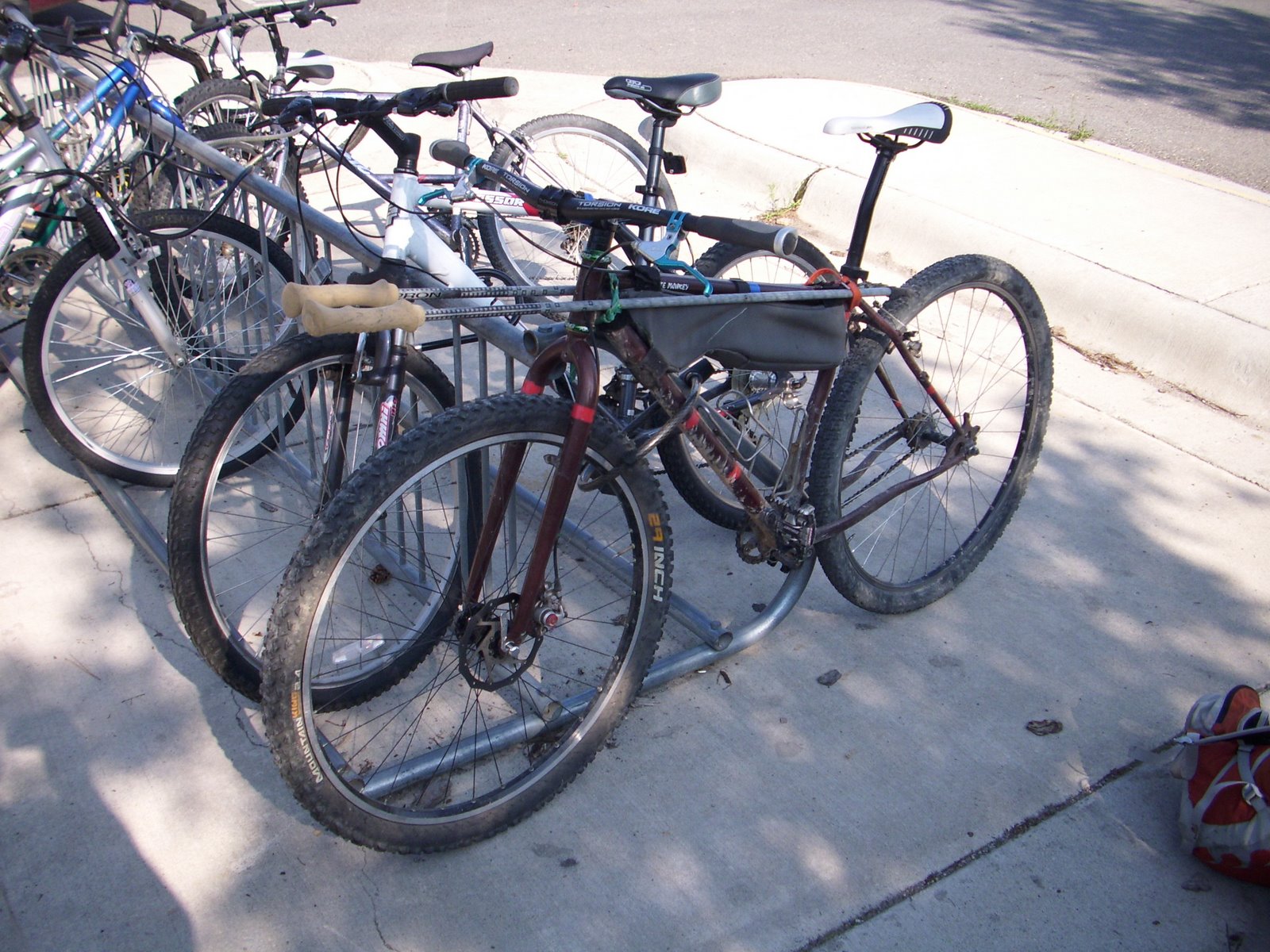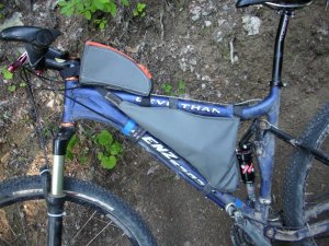 The Leviathan has been restored to full glory: Reba, 8″ front rotor, both tubeless wheels. I’ve made some bags for it (see below). Yesterday I headed out in the occasional rain storms and did intervals on the road out by the railroad tracks. Dead flat, push into the wind, turn around, spin back, repeat. iPod obligatory.