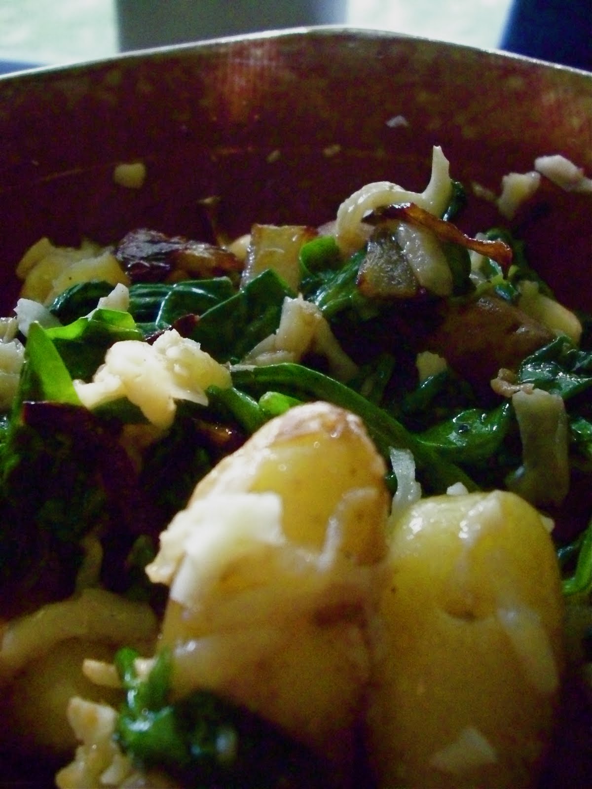 Add spinach to veggies, saute until done, adding a bit more olive oil at the end.