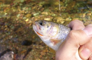 I do like fishing small streams, and a late summer Rattlesnake Creek delivered. I had a few hits and one almost landed at or first stop, as well as a fair bit of time in the bushes untangling snarls. Catching a fish at all more than met expectations, though as we geared up at the second spot, Mike reminded me that I was still “technically skunked” for the day, having not brought one to shore. Walking down to the creek, I thought it would be fun to quickly put that to rest. So I went down, saw a picture-perfect hole under a stump, and landed this guy on the fifth (or so) cast.