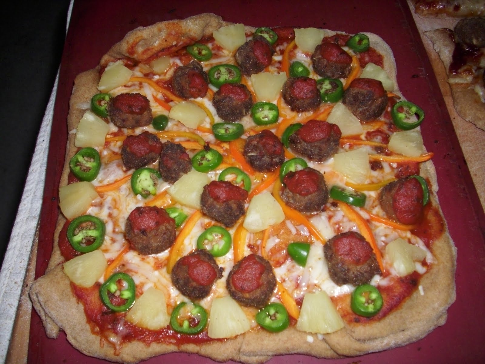 A whole wheat and stout, thin crust pizza with bison meatballs, jalapeno, orange bell pepper, and pineapple.