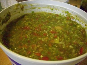 Run it all through a food processor. Not too much now. As you process the veggies, add about 8 oz of a good light, crisp, not sweet wheat beer. (Like Big Sky’s seasonal Belgian Wit.)