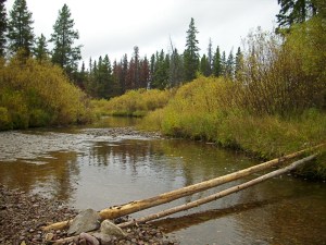 I started at Monture Creek, hiked up Falls Creek over Camp Pass, down directly to the Dry Fork of the Blackfoot, then over the divide into the headwaters of Danaher Creek (and thus into the juridical Bob Marshall). All really excellent walking, Falls pictured above, the crossing of Danaher Creek below.