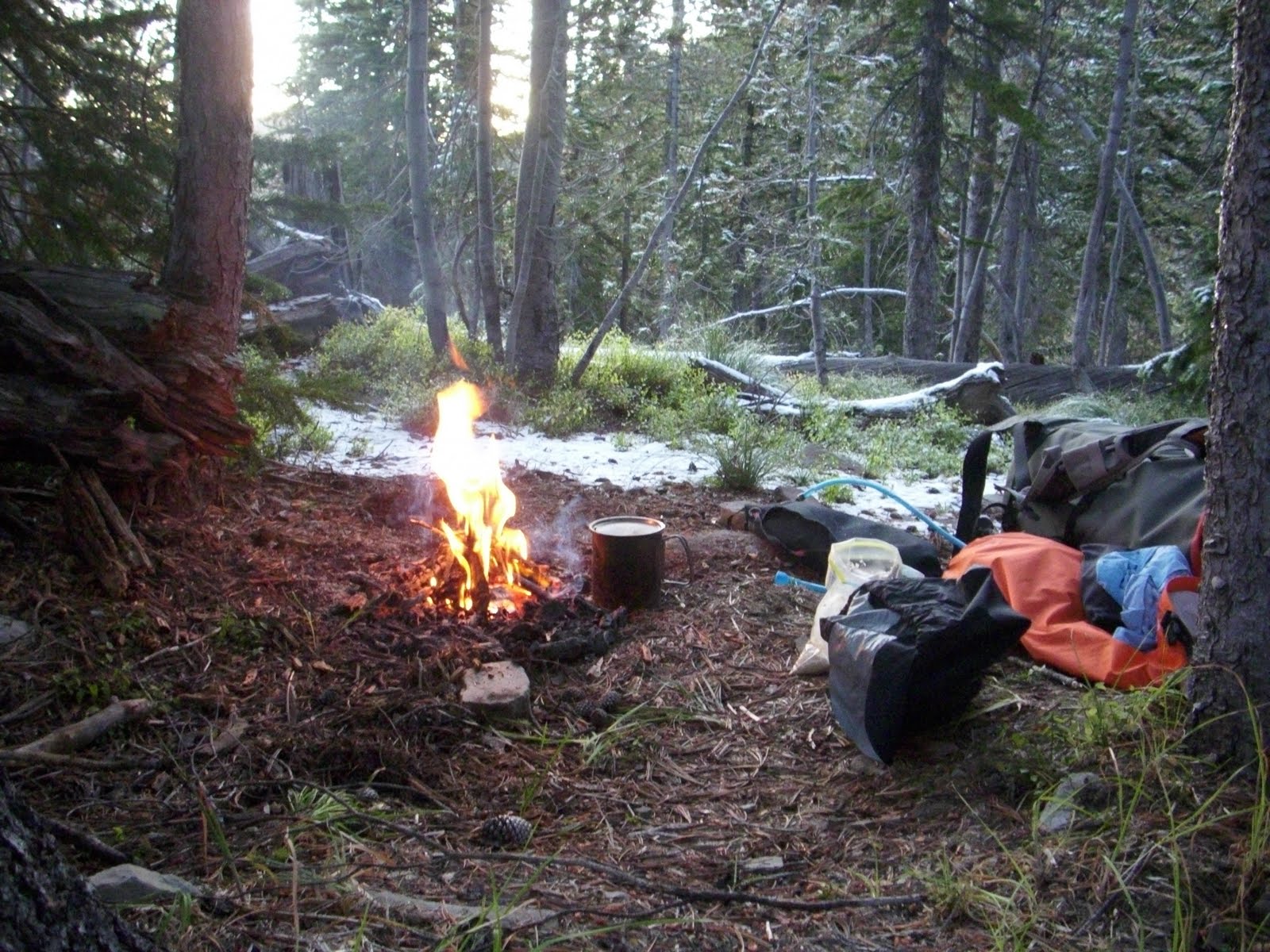 It was a cold night. I find our Western Mountaineering Ultralite conservative for its 20 degree rating, and I was just warm with a pile hoodie and all the hatches battened. Frozen stiff gear and slush in the dromedary indicates low-teens, easy. I saw no reason to get out of bed before 630.