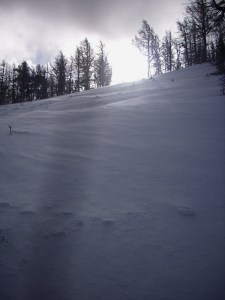 I took snowshoes, and that was a good choice. Until right at 8k there was almost no snow, less than on my camping trip almost four weeks ago. I saw funny tracks on the way up, and around 7.5k passed a couple hiking in full-on freeride AT boots, hauling phat skis with Fritschis. They said you could make turns without bottoming, which I almost believe if you manage to avoid all the logs. You could probably get almost 400 feet of vertical if you count the flat part on top.