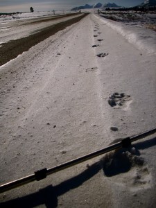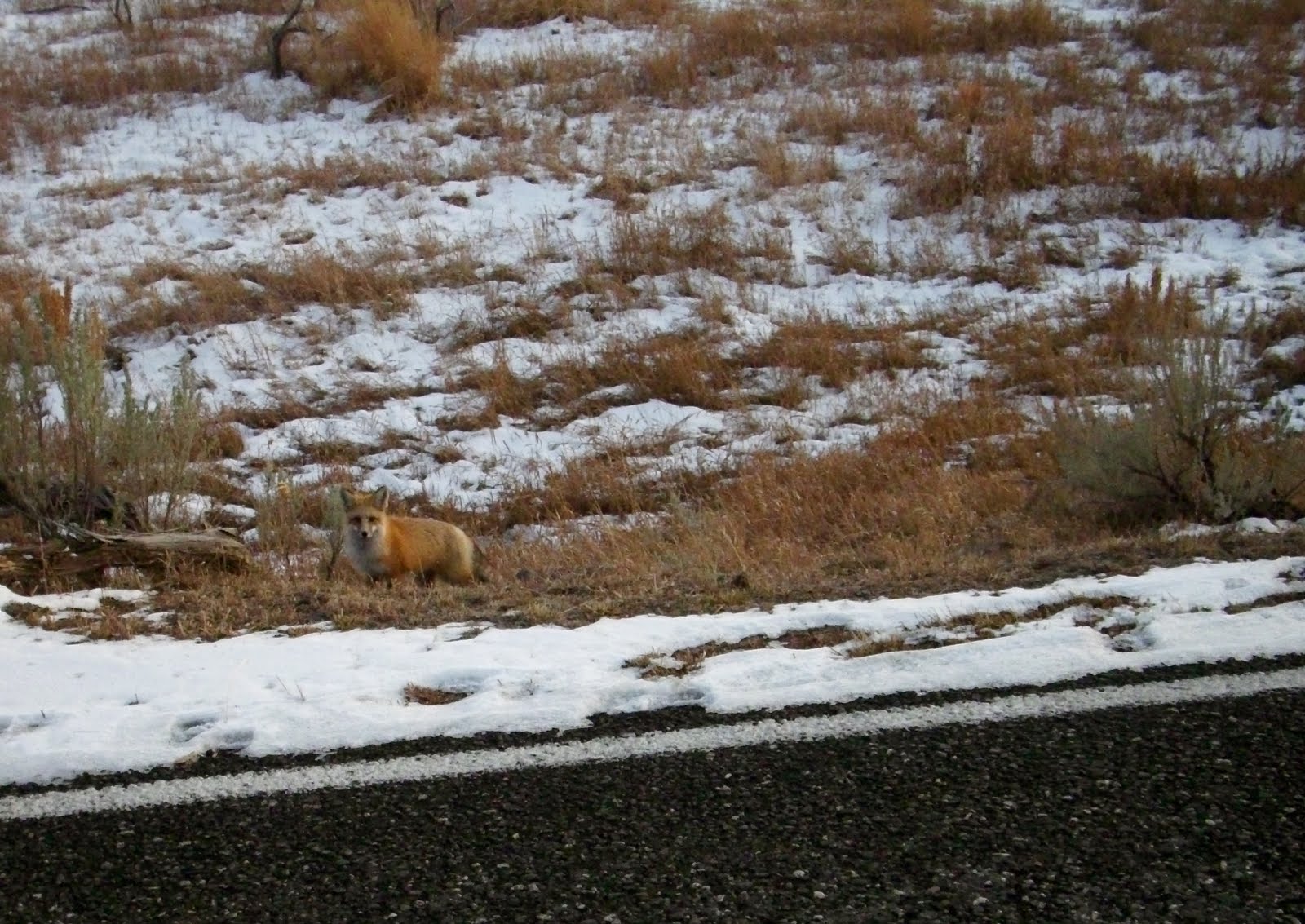 M won for correctly identifying it as a fox, rather than a coyote, as it ran down the road ahead of us. After it ran off I went down and checked out its tracks in the snow. They were barely there.